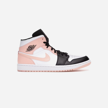 The Air Jordan 1 Mid Crimson Tint Toe is a mid-top basketball shoe. An addition to the sizable list of Air Jordan 1 Mid sneakers, this Crimson Tint colorway features a leather upper with a white base. The white base is contrasted by black leather overlays near the toe, and is accentuated by crimson on the heels, Swooshes, ankle collar, Jumpman tongue motif, and hardened rubber outsole. It has perforated toe boxes for breathability, and cushioned midsoles for increased comfort.