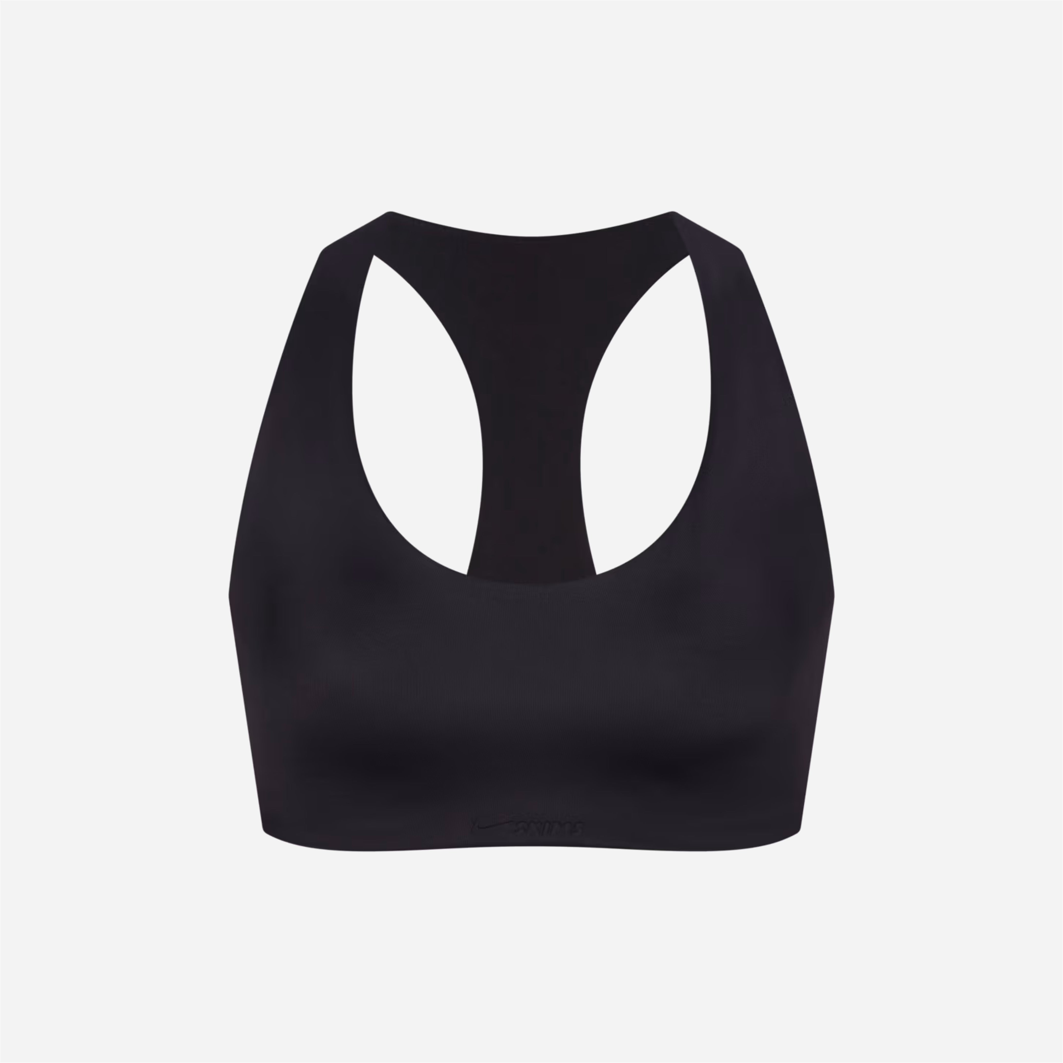 The Nike X Skims Shine Racerback Bra in Obsidian offers premium athletic support and high fashion style for your workouts. This shimmering bra features a supportive racerback design and a comfortable fit, blending Nike performance technology with Skims luxurious fabric. It is perfect for active women seeking both quality and aesthetic appeal in their sportswear collection.