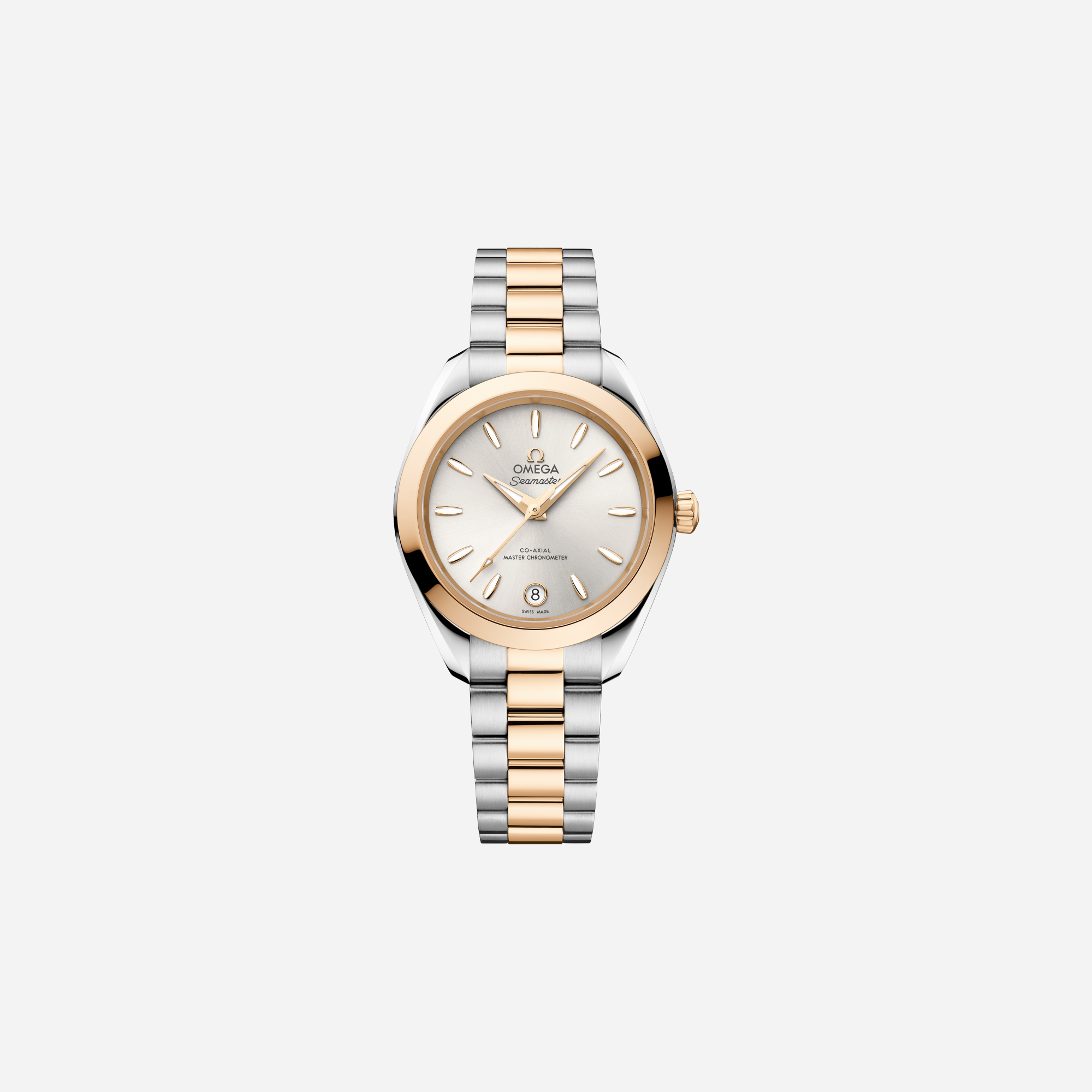 The Omega Seamaster Aqua Terra 150M is a luxurious timepiece featuring a silvery dial and a blend of steel and Moonshine Gold on the strap. This exquisite watch is designed for elegance and precision making it an ideal choice for collectors seeking a high-quality dependable Swiss watch.