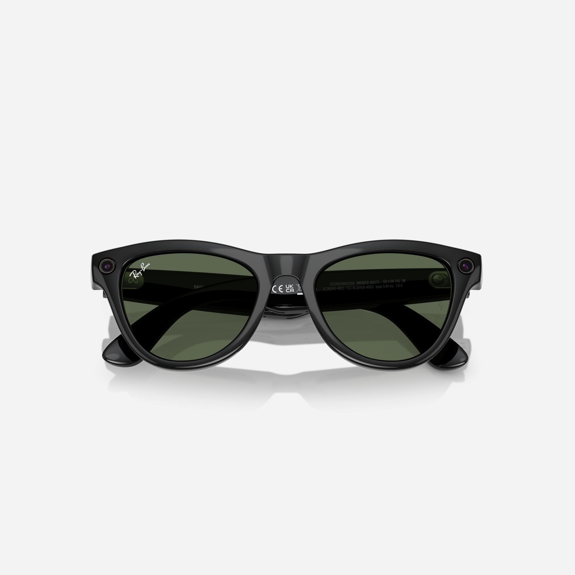 Stay connected in style with the Ray Ban Meta Skyler Shiny Black Green Gen 1 Featuring a cat eye shape shiny black nylon and propionate frame G15 green solid polycarbonate lenses touch and voice controls dual open ear speakers five mic array 32GB storage WiFi 6 and Bluetooth 5.2