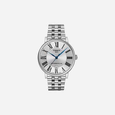 The Tissot Carson Premium Powermatic 80 watch features an elegant leaf dial and a silver stainless steel strap. This 40mm timepiece is powered by the reliable Powermatic 80 automatic movement, offering exceptional precision and a long power reserve. Discover luxury and classic design with this beautiful Tissot watch.