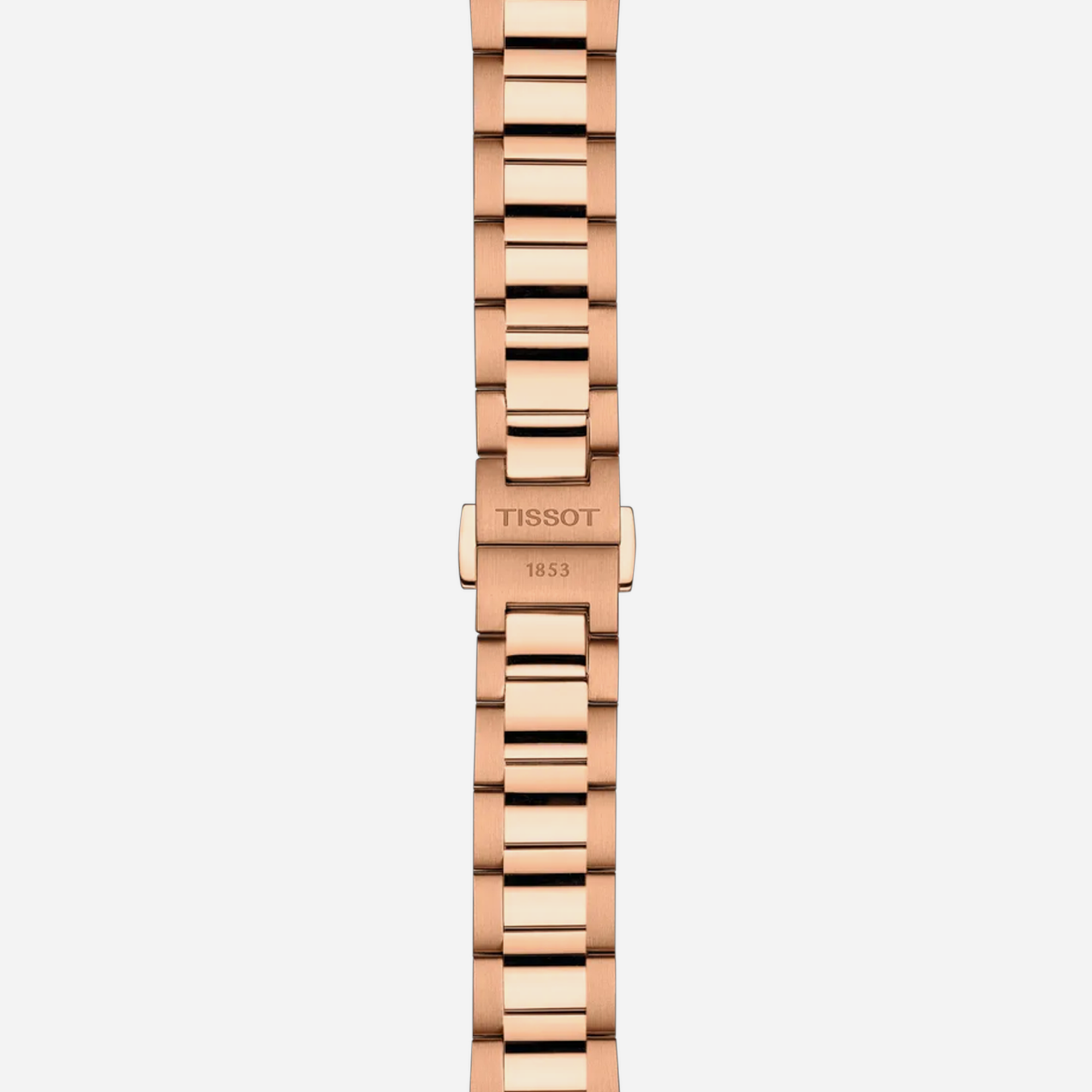 The Tissot PR 100 women's watch is a luxurious and elegant timepiece featuring a stunning 34mm white mother-of-pearl dial. This rose gold PVD watch offers Swiss quality and precision, perfect for everyday wear or special occasions. Its classic design and durable construction ensure long-lasting style and reliability.