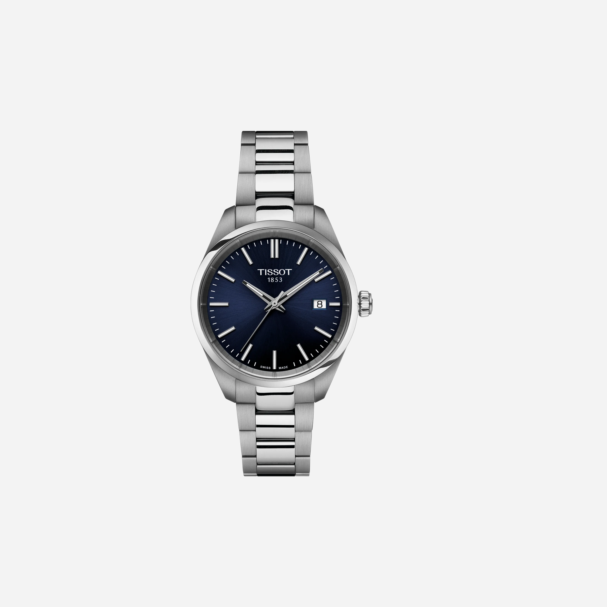 The Tissot PR 100 34mm watch features a stunning blue dial and a durable silver stainless steel bracelet. This timeless Swiss timepiece offers precision and elegance for everyday wear. Perfect for those seeking a sophisticated yet resilient accessory, it combines classic design with Tissot's renowned craftsmanship.