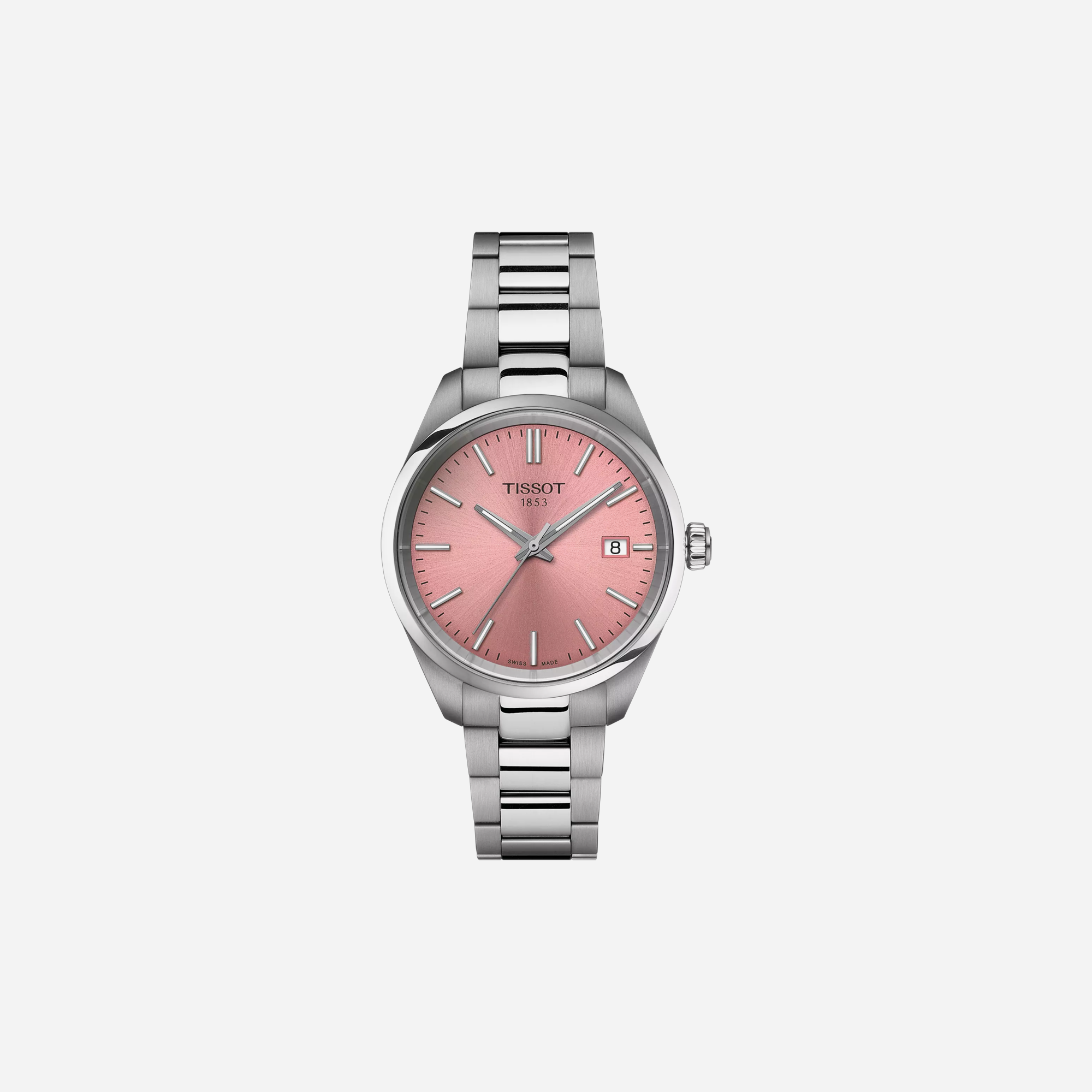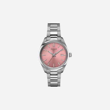 The Tissot PR 100 watch is a chic and sophisticated womens timepiece. This 34mm silver stainless steel watch features an elegant pink dial perfect for everyday wear. It is a durable and classic accessory designed for reliability and style.