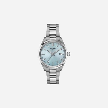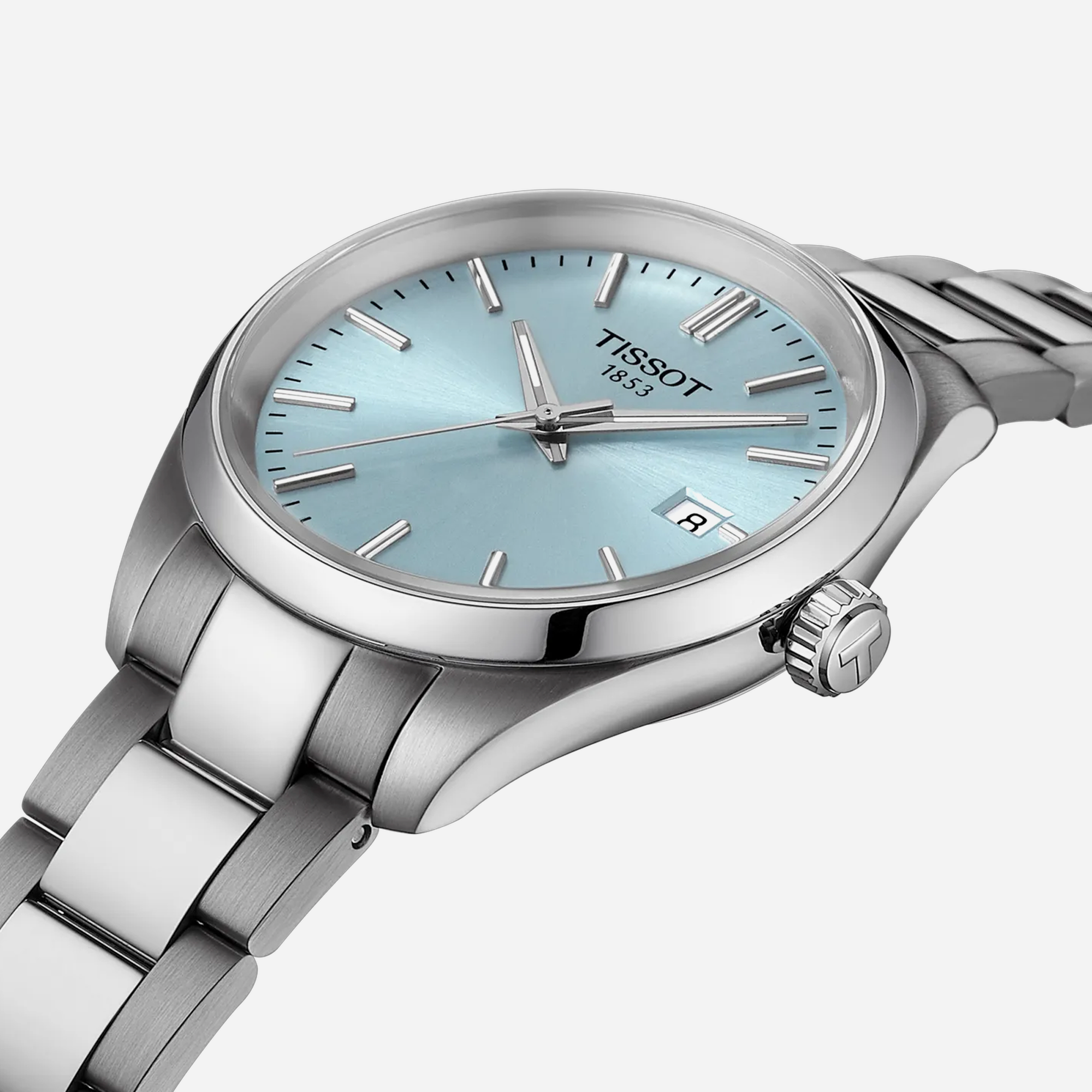 The Tissot PR 100 is an elegant and reliable watch featuring a vibrant blue dial and a sleek silver stainless steel case. This 34mm timepiece offers a classic and versatile look for everyday wear. It is a perfect addition to any collection offering Swiss precision and enduring style.