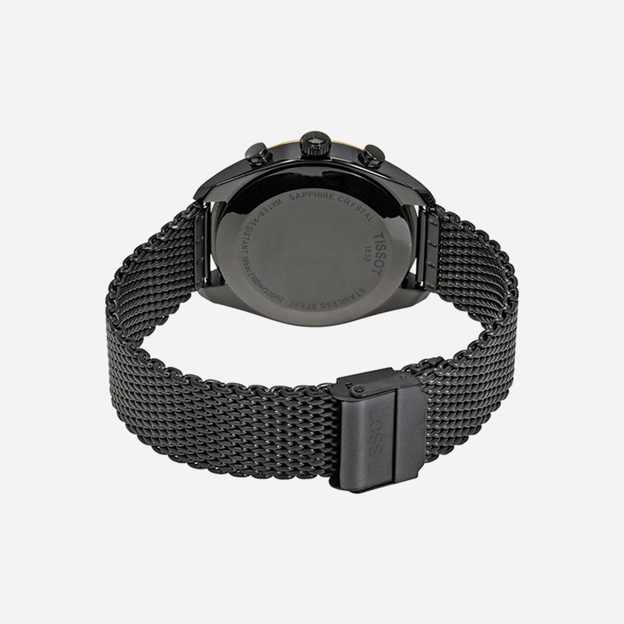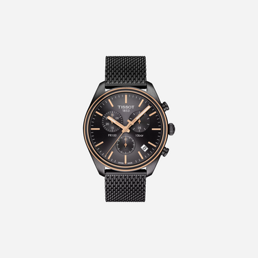 The Tissot PR 100 Chronograph is a sophisticated 41mm timepiece featuring a bold black dial and a matching black strap. This elegant watch combines precision chronograph functions with classic style making it a perfect accessory for any occasion. It is a durable and reliable Swiss-made luxury watch.