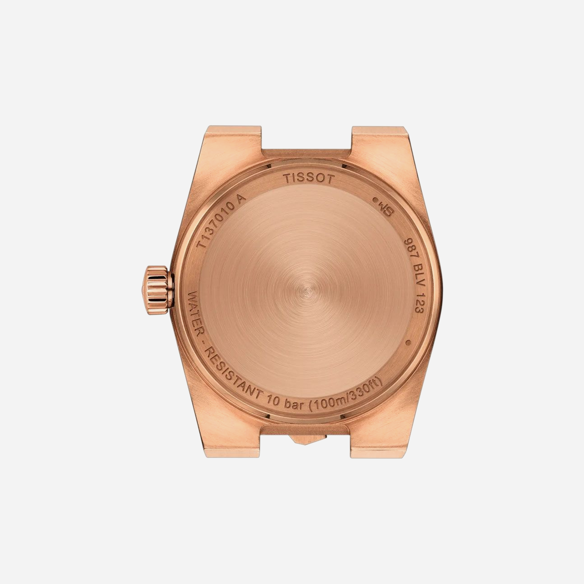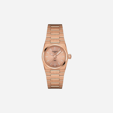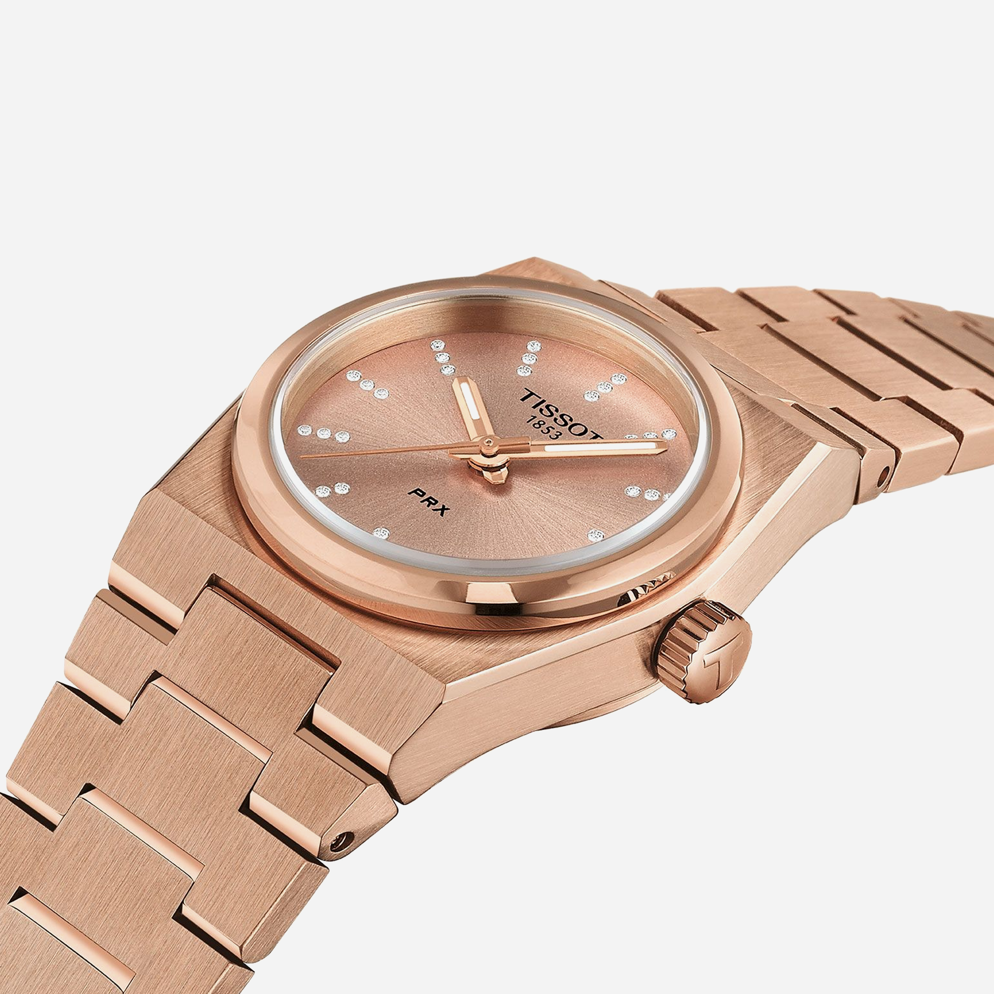 The Tissot PRX 25mm watch showcases a stunning salmon dial and elegant rose gold stainless steel construction. This fashionable timepiece features a durable rose gold PVD strap. Perfect for sophisticated wear, the PRX combines classic design with modern reliability, making it a desirable addition to any collection.