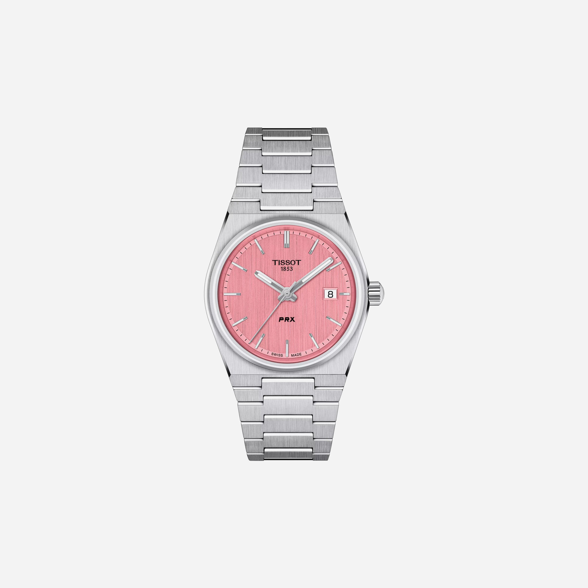 The Tissot PRX 35mm Pink Dial Silver Stainless Steel Watch is a luxurious timepiece perfect for everyday elegance. This stunning watch features a beautiful pink dial and a sleek silver stainless steel bracelet. Its modern design and Swiss quality craftsmanship ensure reliability and style. Enjoy this timeless accessory.