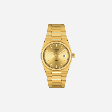 The Tissot PRX 35mm Quartz watch is a luxurious timepiece featuring a stunning yellow gold dial and stainless steel yellow gold PVD strap. This elegant Tissot watch offers Swiss quartz precision in a sleek, retro-inspired design. Perfect for everyday wear or special occasions, this 35mm PRX delivers reliable style and exceptional value for watch enthusiasts.