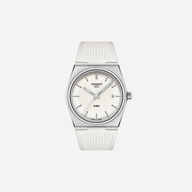 The Tissot PRX White Dial White Rubber Strap Watch is a sleek and modern timepiece perfect for contemporary style. This 40mm watch features a striking white dial and comfortable white rubber strap, combining Swiss precision with a sporty aesthetic. It's the ideal accessory for daily wear.