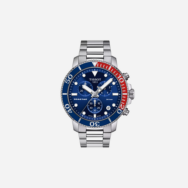 The Tissot Seastar 1000 Quartz Chronograph is a diving watch with a sharp quartz dial and durable silver stainless steel construction. This watch is a precise and stylish timepiece for water activities and everyday wear. Its robust design ensures reliability for all adventures.