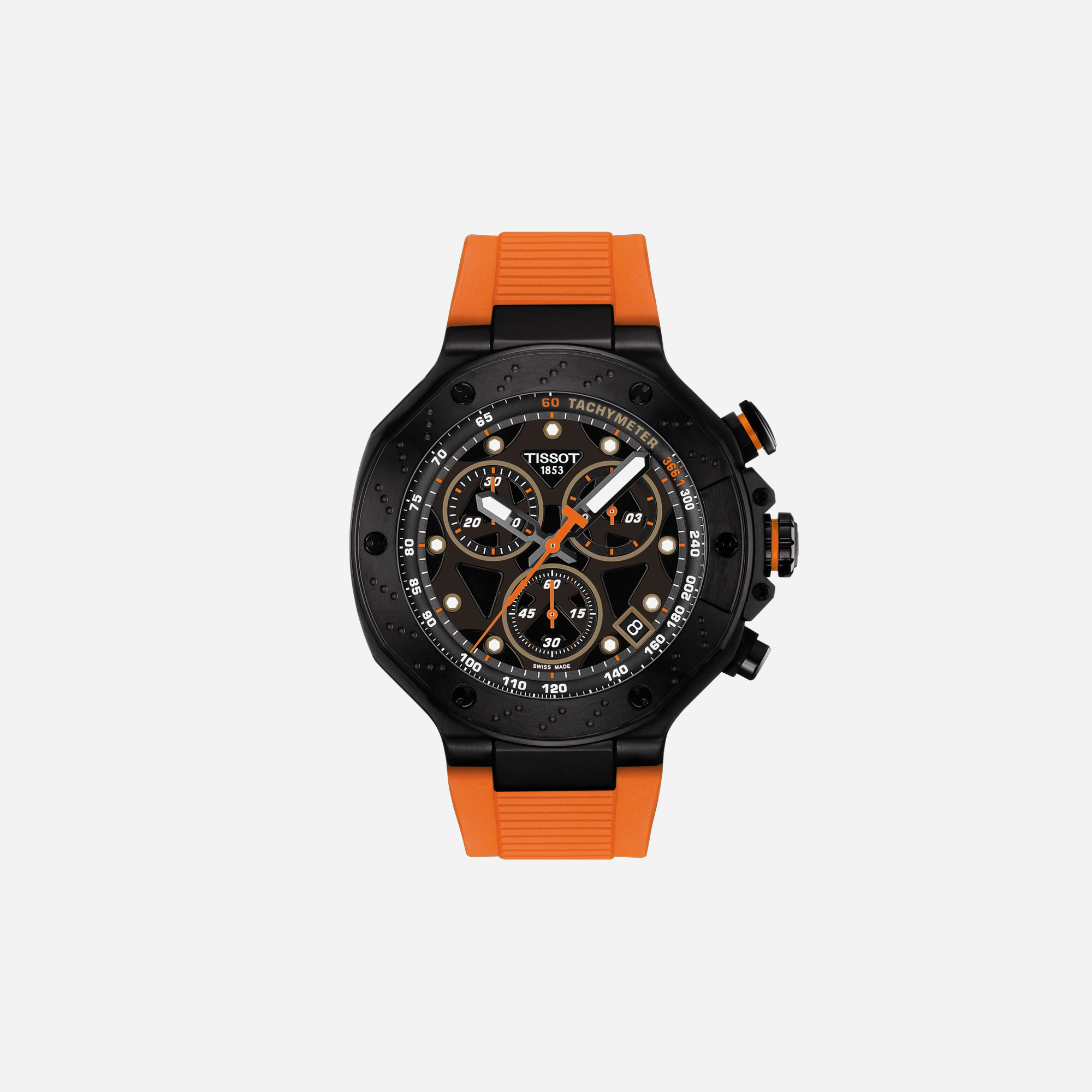 The Tissot T-Race Quartz Chronograph is a dynamic 45mm watch featuring a bold black dial and striking orange rubber strap. This sporty timepiece offers precise chronograph function and rugged durability. Perfect for racing enthusiasts, it combines high performance with Tissot's signature style for an active lifestyle.
