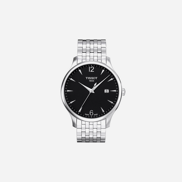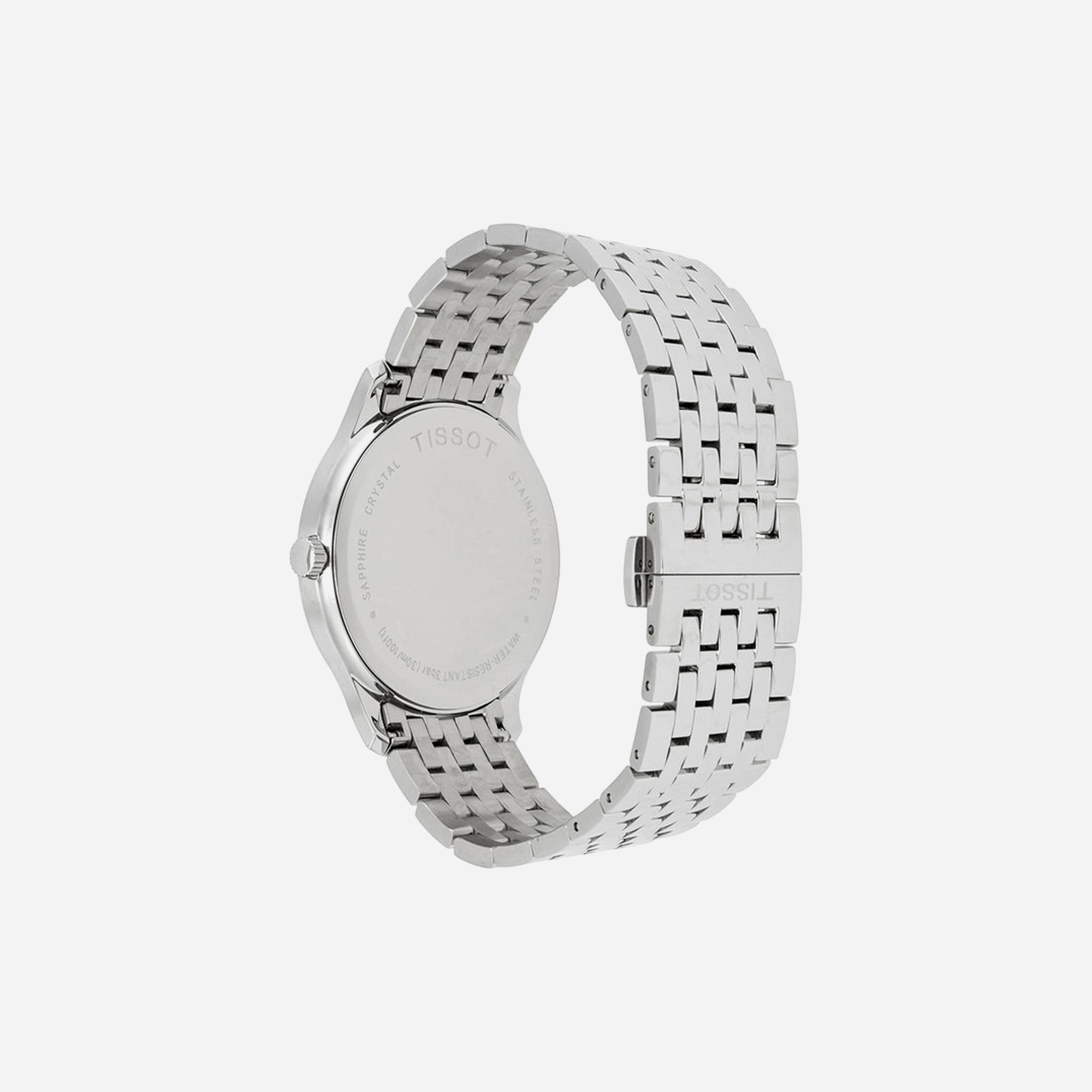 The Tissot Tradition Quartz watch with a sophisticated grey dial and stainless steel bracelet offers timeless elegance and reliable quartz movement. This classic timepiece is perfect for everyday wear and formal occasions, providing exceptional value and a sleek, versatile look for watch enthusiasts seeking quality Tissot design.