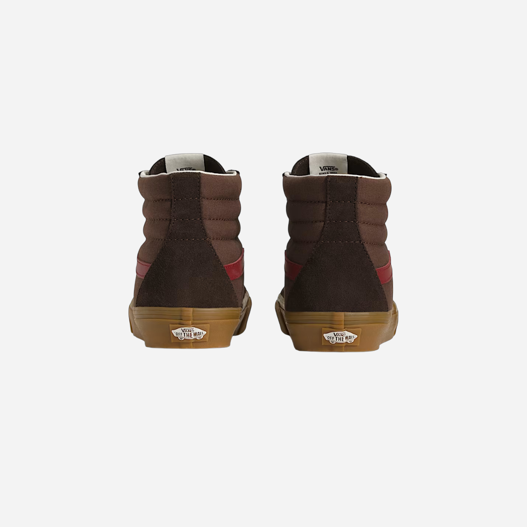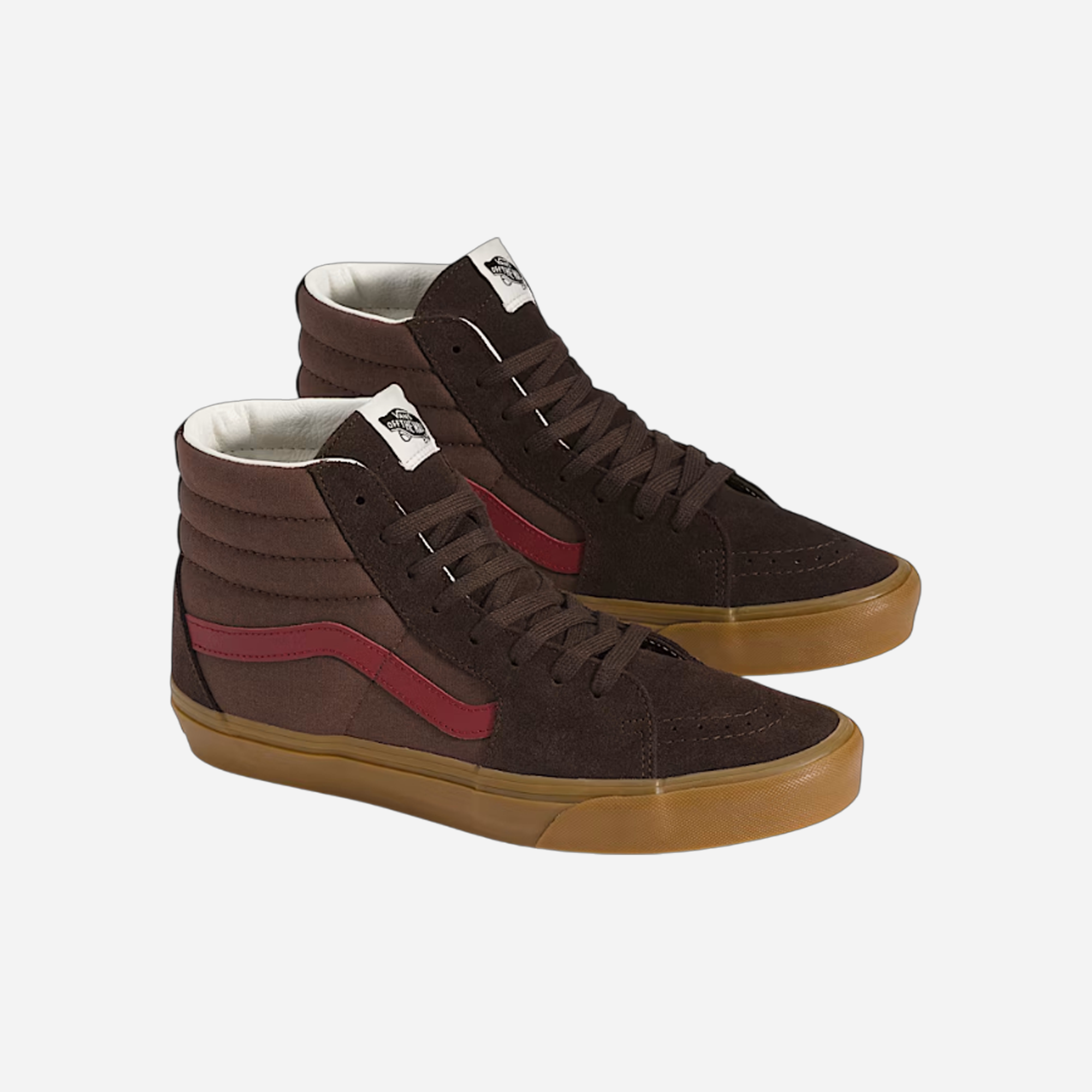 The Vans Sk8-Hi Gum Shoe in brown features a classic high-top silhouette with a durable suede and canvas upper. These iconic shoes are designed for comfort and style, boasting a signature waffle outsole for reliable grip and a distinctive gum sole finish. Perfect for everyday wear or skate performance.