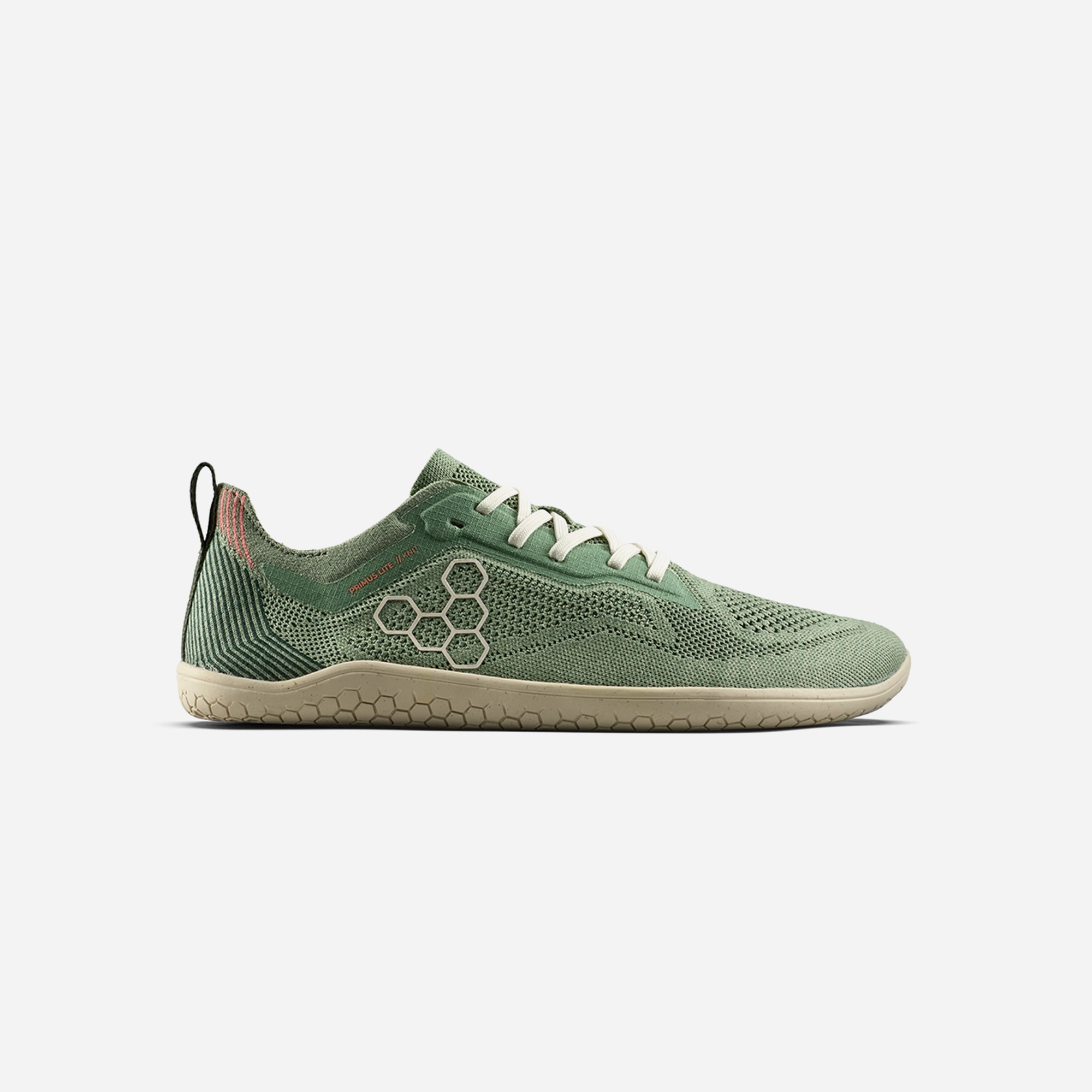 VivoBarefoot Primus Lite Knit Natural Dusty Green offers minimalist barefoot running with breathable knit upper and natural coconut colorway. Lightweight design promotes natural foot movement and ground connection. Ideal for runners seeking authentic barefoot experience with modern comfort technology and sustainable materials.
