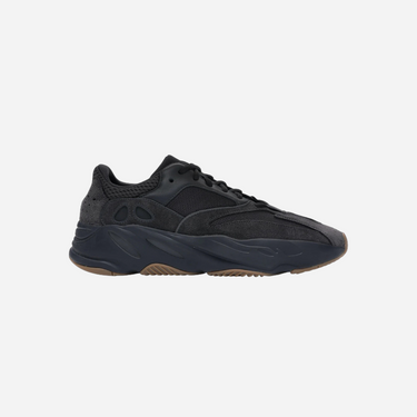 The Yeezy Boost 700, designed by Kanye West, first debuted at the Yeezy Season 5 fashion show in February 2017. The 'Utility Black' colorway from June 2019 features a mesh upper with plush suede and smooth leather overlays. The sneakers signature chunky midsole encapsulates adidas' revolutionary Boost cushioning in a full-length format, providing responsive comfort. Underfoot, the gum rubber tread ensures durability and traction. The design combines style and performance, making it a standout in the Yeezy lineup.